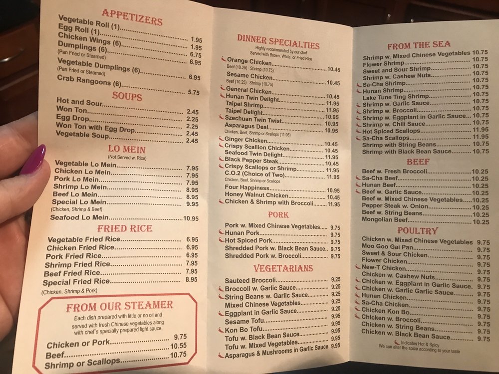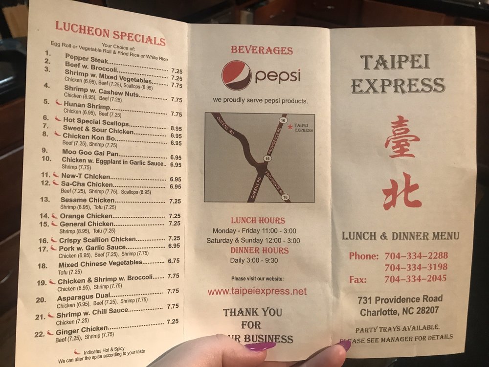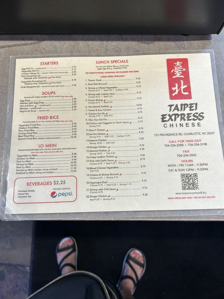 Taipei Express offers a variety of Chinese dishes for lunch and dinner, with options for delivery and reservations. The menu includes classics like Egg Rolls, Chicken Wings, Crab Rangoons, and various types of soups and fried rice. Customers praise the consistency and quality of the food, with favorites like General Tso's Chicken and Hunan Beef standing out. Reviews also highlight the flavorful chicken dishes and the popular Crispy Scallion Chicken. While some reviewers mention inconsistencies in menu pricing, overall, Taipei Express is recommended for those craving authentic Chinese takeout in Charlotte. With large portions, friendly service, and delicious options like Sesame Chicken and Vegetable Fried Rice, Taipei Express has become a favorite spot for many looking for satisfying Chinese cuisine.